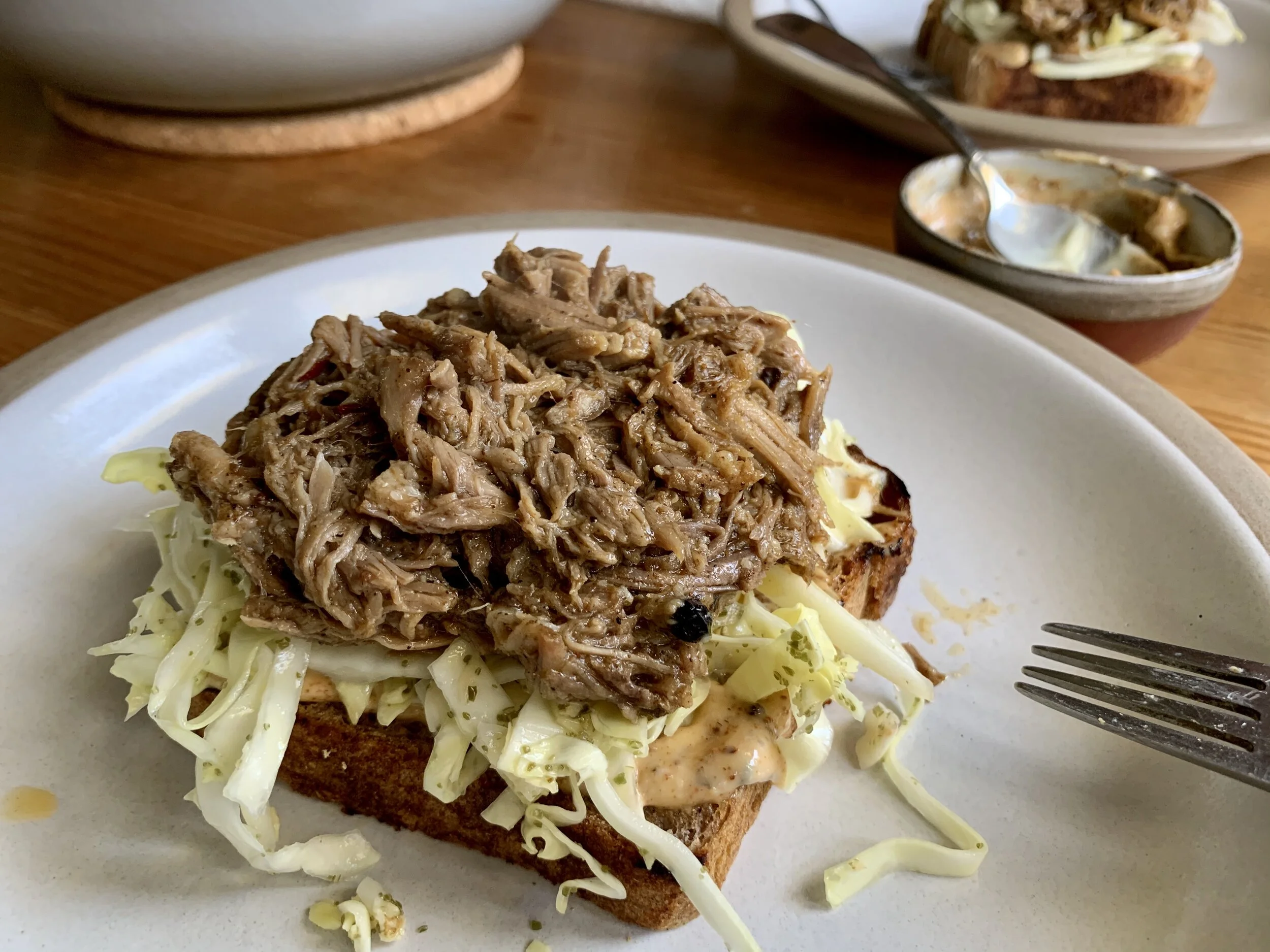 5 - Toast your bread, top with mayo/harissa sauce, a layer of the slaw, and the shredded pork.